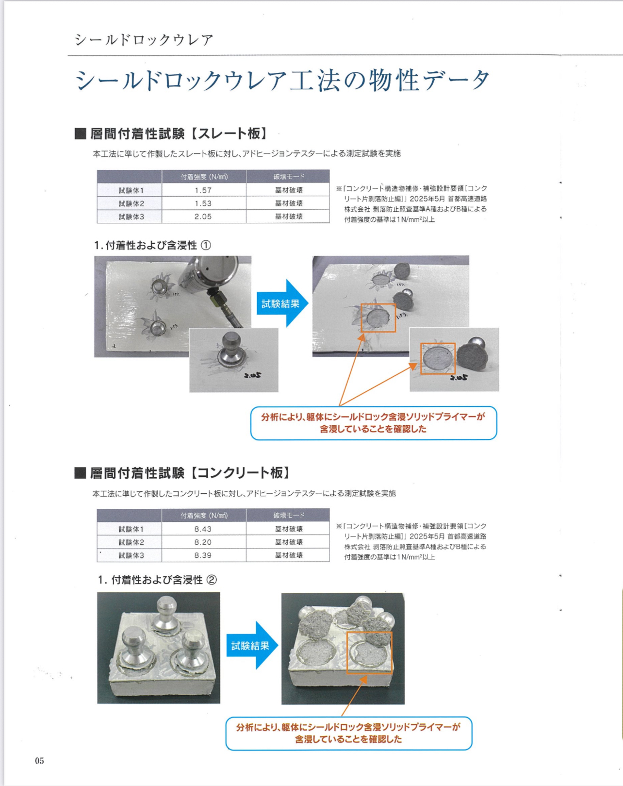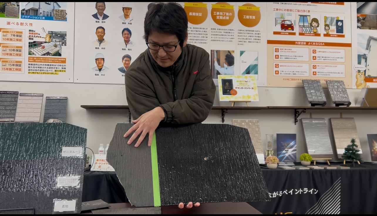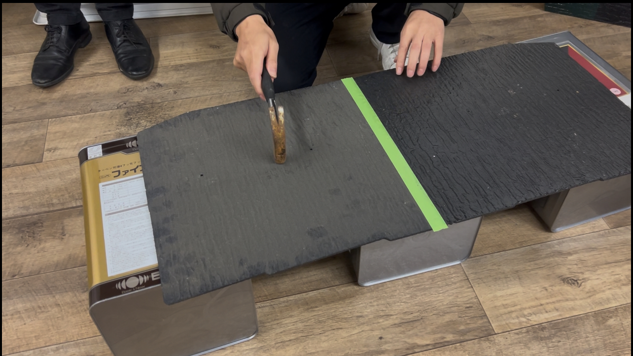 既存コロニアルは2回の打診で割れてしまいましたが、シールドロック含浸ソリッドプライマーを塗布したコロニアルは穴が空くまで打診してもコロニアルはわれませんでした。
